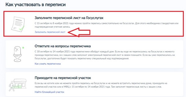 Перепись на Госуслугах. Все, у кого есть аккаунт на портале, могут заполнить электронный переписной лист на сайте или в приложении. Для этого нужно выбрать услугу «Пройти перепись населения» и ответить на вопросы. Переписать можно не только себя, но и всех членов семьи, например супруга и детей. Ответить на вопросы нужно до 8 ноября. После этого на телефон придёт QR-код — один на семью — и цифровой код на каждого члена семьи. Их нужно предъявить переписчику, который будет обходить дома и квартиры, тогда он будет знать, что человек уже принял участие в переписи, и не станет задавать вопросы во второй раз.